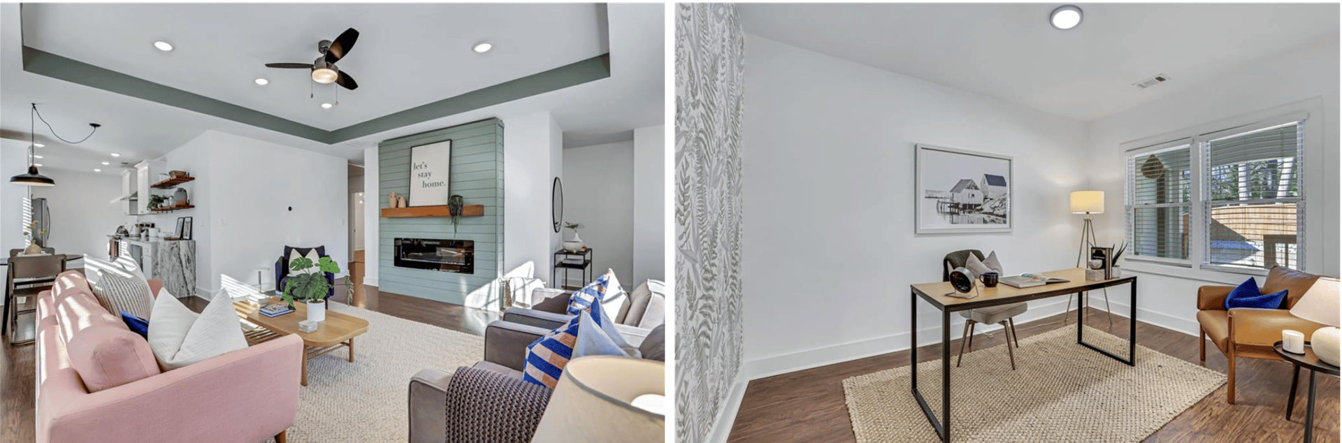 As you step inside, you’re greeted by an oversized family room with a custom fireplace accent wall, creating a focal point for both relaxation and entertainment. The home’s inviting aura is further enhanced by its well-thought-out layout and ambient lighting.