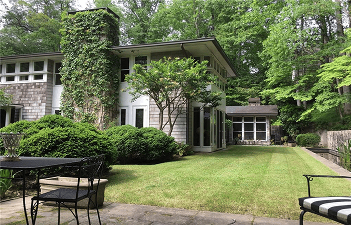 This stunning Sandy Springs home features a terrace level that leads out to new pebble tech pool surrounded by wood decking. The master bedroom is on the main floor with exposed beams and a wood-burning fireplace.