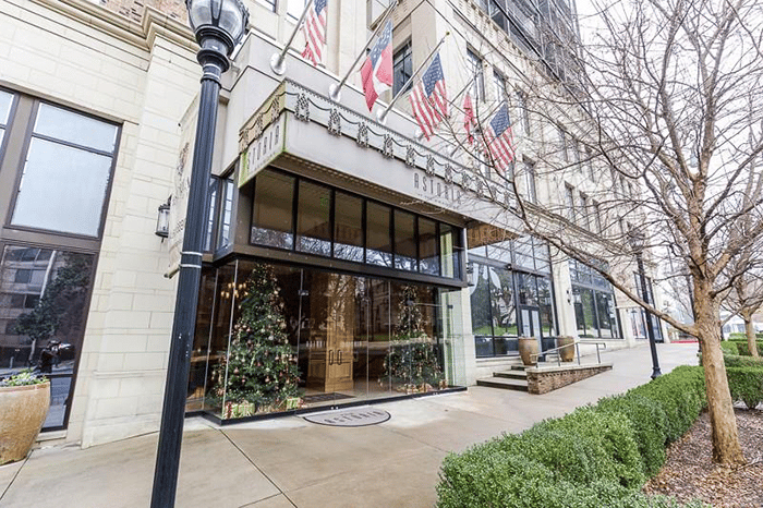 This beautiful two bedroom/two-and-a-half bath unit at The Astoria — one of Buckhead’s best boutique condo buildings — has a private entry foyer leading to an open dining room and living room area with a fireplace. The kitchen features Thermador appliances, Kohler fixtures, and custom stained cabinetry.