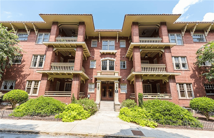 This picture perfect historic condo on Piedmont Park is a light-filled corner unit featuring 10-foot coffered ceilings, hardwoods and a covered patio overlooking a lush courtyard.